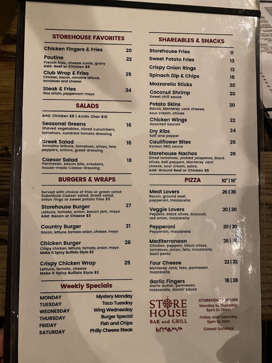 Welcome to The Storehouse Bar & Grill, a vibrant dining spot in Iqaluit that promises delicious food and a welcoming atmosphere. Specializing in 100% beef burgers, their menu features standout options like the Swiss Mushroom Melt Burger and the classic Storehouse Burger.